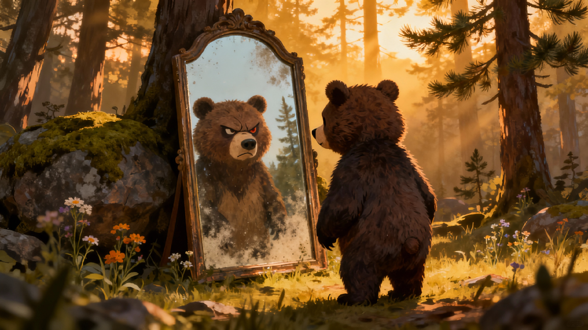В одном большом лесу, полном зелени и шумных ручьёв, жил маленький медвежонок по имени Миша. Миша был добрым и весёлым, но часто попадал в неприятности. Однажды, прогуливаясь по лесу, он наткнулся на старое, покрытое мхом зеркало. Зеркало было необычным — оно не просто отражало внешность, как все зеркала. Это зеркало показывало не то, что было на поверхности, а внутренний мир того, кто смотрел в него. Когда Миша взглянул в зеркало, он увидел, как оно отражает его доброту. Он был счастлив: зеркало показывало, что он хороший медвежонок, который всегда готов помочь другим. Но вот как-то раз, разгневавшись на своего друга зайца, он толкнул его. Зеркало сразу же показало, как Миша был злым и агрессивным, и его отражение стало мрачным и грозным. Звери, проходившие мимо, заметили, что зеркало показывало внутренний мир Миши. Сначала они не обращали внимания, но когда он снова разозлился, зеркальное отражение Миши стало ещё более зловещим. Старые мудрые звери, такие как ёжик и сова, начали зам