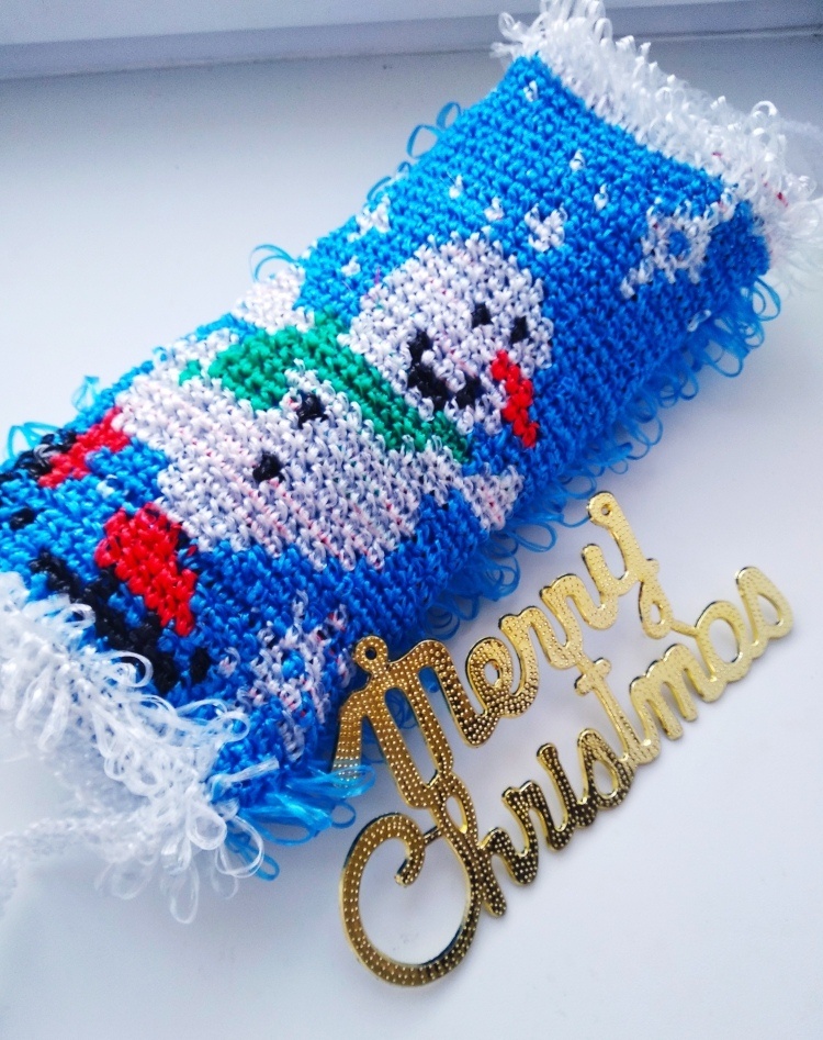 Один из вариантов новогоднего подарка — банная мочалка, связанная крючком. В качестве мотива подойдет любой зимний элемент, например снежинки, елочные игрушки или новогодние сюжеты. По аналогии со схемами для вышивки крестиком составляется схема вязания, обозначающая каждый стежок цветом или символом. Сам процесс вязания мочалки стандартный: создается основа, формируются ручки и манжета. Однако одна сторона отличается наличием узора, выполненного согласно заранее составленной схеме путем чередования разноцветных нитей. В последующих публикациях планирую подробно рассказать о технике вязания декоративных мочалок подобного типа. Если эта тема вызовет интерес у подписчиков моего канала.
