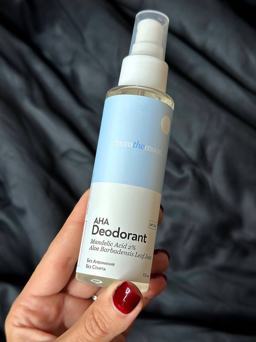 Дезодорант действительно хороший, выполняет заявленные функции и, не смотря на то, что он жидкий, им удобно пользоваться. Смесь AHA-кислот создают среду, в которой бактерии не могут размножаться, поэтому нет неприятного запаха. Уровень PH 3.6-достаточный, чтобы справиться с бактериями, но не вызвать раздражения кожи. Он увлажняет кожу за счет растительных компонентов и самое главное - не мешает естественным процессам потоотделения. Отдушка у Fromthemoon нейтральная, не перебивает аромат духов и крема для тела.