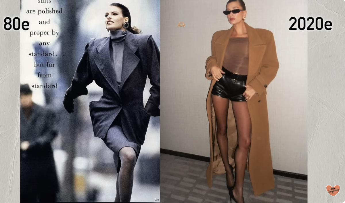 Самая главная черта моды восьмидесятых — это пиджаки мужского кроя, пальто и тренчи с утрированно широкой линией плеч.