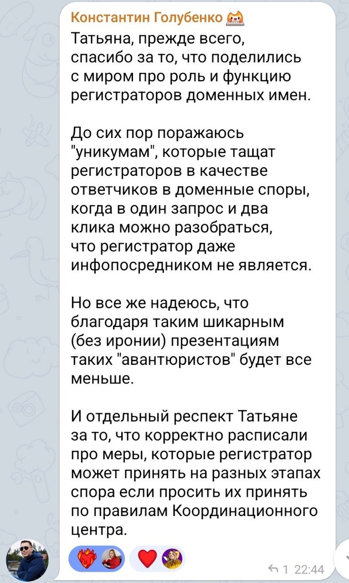 🎯 А вот и первые отзывы от коллег, которые прослушали подкаст. Особенно приятно получать такое от Константина Голубенко, чей подкаст про хостинг-провайдеров я сама с интересом послушала, и который замотивировал меня написать Анне Лапе и предложить провести подкаст про регистраторов доменных имен и доменные споры.