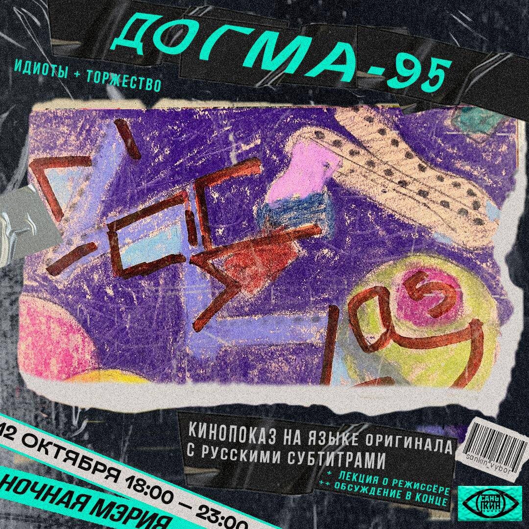 ВЕЧЕР ДОГМЫ-95 ИДИОТЫ (1998) + ТОРЖЕСТВО (1998) 🗓️ 12 октября 18:00 📍 Льва Толстого, 71/11 (вход со двора) 🎬 «Мы поклялись очистить кино от лжи!» — так начинался манифест Догмы-95, подписанный в Копенгагене в 1995 году Ларсом фон Триером и Томасом Винтербергом. Их цель — вернуть искусству подлинность, а зрителю — доверие. Никаких спецэффектов, искусственного света и нарочитых сюжетов — только суровая реальность. Именно этот манифест и сделал любимого всеми Триера мировой кинозвездой! 📜 Клятва целомудрия (выдержки из манифеста): 📀Съёмка — только на натуре, без декораций. 📀Только живой звук, без наложенной музыки. 📀Камера — ручная, оператор движется вместе с действием. 📀Никаких жанровых фильмов и авторских подписей. 📀Всё должно происходить здесь и сейчас. 📀Догма-95 — не просто движение, а попытка вернуть кино к его сути: человеческому лицу и внутренней правде. 18:00 | «Идиоты» — скандальный, шокирующий и в то же время уязвимый фильм Ларса фон Триера. Группа молодых людей