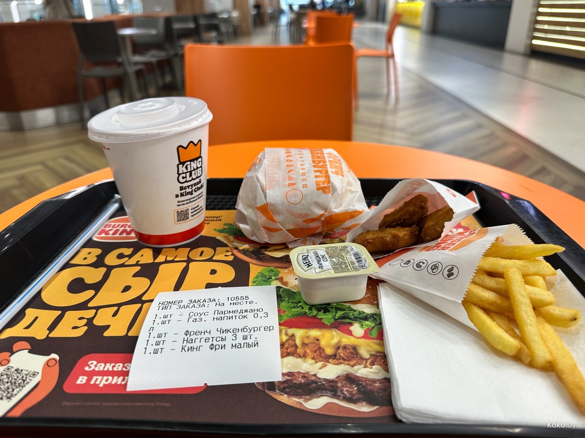 На моей памяти таких купонов в «Бургер Кинга» ещё не запускали. За всего 5,50р на подносе окажется: Френч Чикенбургер, маленькая картошка фри, три куриных наггетса или столько же луковых колец, соус на ваш выбор и стакан любой газировки. Выглядит, как ситуативная ответочка поставившему на стоп по продуктам купону 5 за 5,50р в «КФС». Запоминайте, купон на еду будет действует с 10 октября и пока не наедитесь во всех «Бургер Кингах» страны. Купон не распространяется на доставку и рестораны, расположенные на территории Национального аэропорта «Минск-2». Для того, чтобы воспользоваться купоном, нужно выбрать способ получения заказа «В ресторане» или на «Драйве» в раздел «Купоны». Тезисами и по делу: когда голодный - это мощный буст углеводов, топ за свои деньги по цене маленькой чашечки капучино. Распространить. ВСЕ АКЦИИ