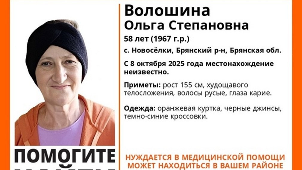 🔴В Брянской области ищут 58-летнюю пропавшую Ольгу Волошину. С 8 октября ее местонахождение неизвестно.