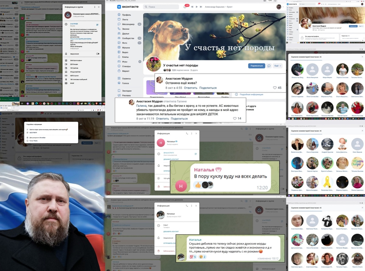 1. В мессенджере «Telegram» в зоозащитном канале «Комментарии канала ВСЕРОССИЙСКОЕ НАРОДНОЕ ЭКОЛОГИЧЕСКОЕ ЗООЗАЩИТНОЕ ДВИЖЕНИЕ» (t.me/VRNZD), насчитывающем 3 438 участников, содержится информация, по моему мнению, с признаками запрещённого на территории Российской Федерации контекста. В публикациях и обсуждениях указанного канала пропагандируется использование сатанинских обрядов в отношении депутатов Государственной Думы, а также высказываются угрозы в адрес детей лиц, не согласных с зоозащитной повесткой, направленной на защиту бродячих собак.