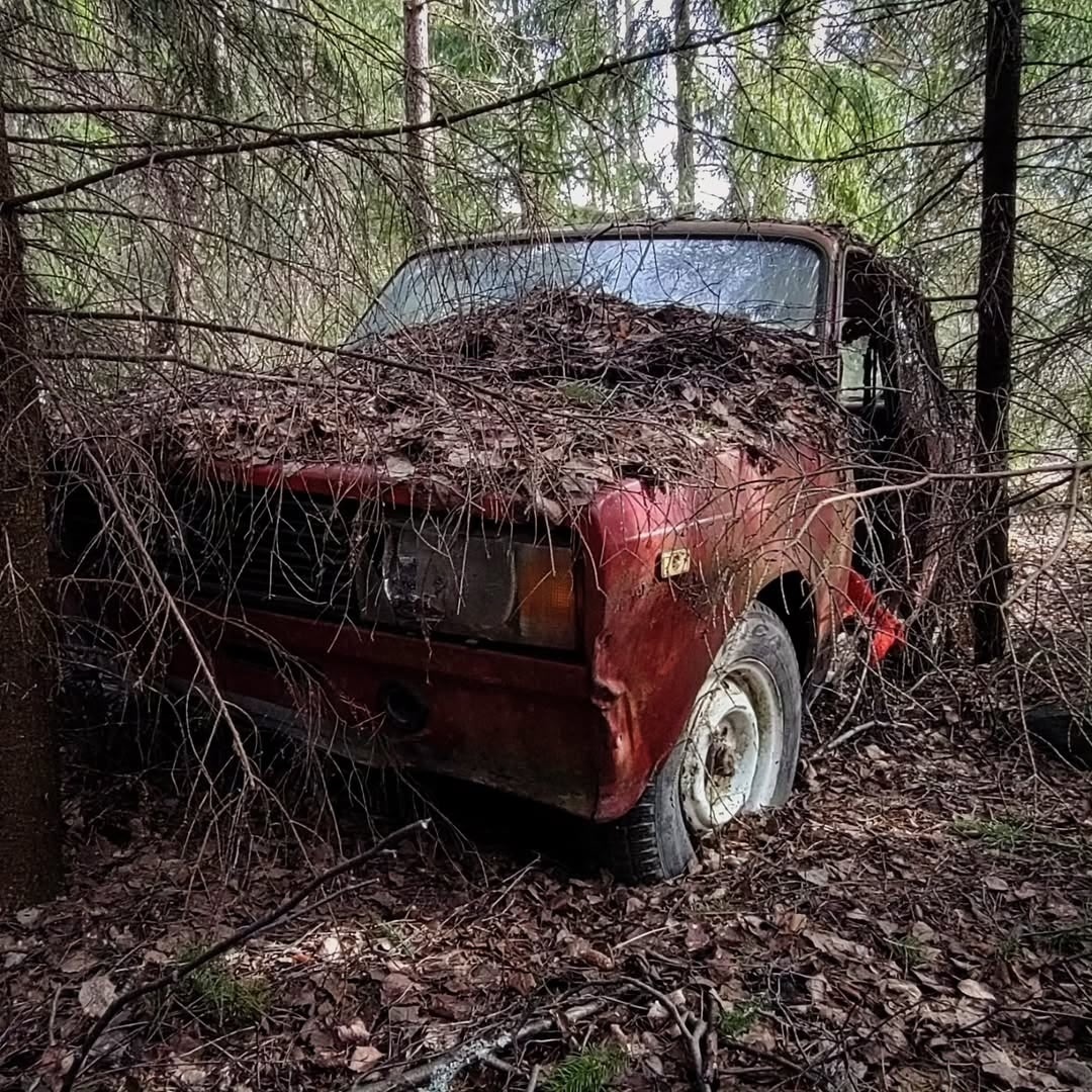 Мои выходные прошли в поисках очередных финских поселений начала двадцатого века — я шёл по следам старых хуторов, где когда-то звенели топоры, пахло дымом печей и говорили на языке, почти стёртом временем, — но вместо ржавого плуга или кованого инструмента я нашёл сокровище, которое лес бережно хранил десятилетиями: красную ВАЗ-2105, утонувшую в мху, ветвях и тишине под Выборгом, словно корабль, потерпевший крушение не в море, а во времени.