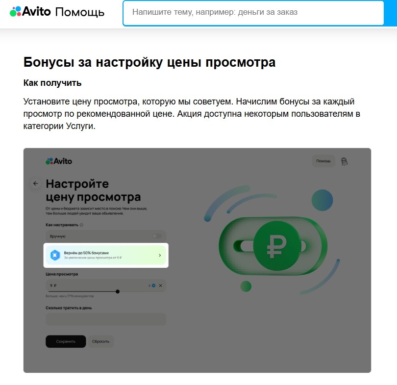 Всем привет! Сегодня хочу без воды и сложных терминов разобрать одну из самых выгодных, но почему-то малопонятных фишек Авито для специалистов из сферы услуг — бонусы за настройку цены просмотра. Скажите честно, вы когда-нибудь видели это окно с предложением увеличить цену просмотра . «Это реальные деньги, которые Авито готово доплачивать вам за правильные настройки. Давайте на примерах. Что это за зверь и как он работает? Вам советуют цену. Когда вы вручную настраиваете стоимость просмотра для своего объявления (например, ремонт квартир или парикмахерские услуги), Авито анализирует рынок и показывает вам рекомендуемую цену. Чаще всего она выше той, что стоит по умолчанию. Вот эту самую цену и нужно установить. Вам капают бонусы. За каждый просмотр, который вы получите по этой повышенной цене, вам на авансовый счет начисляются бонусы. Как на скрине: было 6 рублей, стало 9. За каждый просмотр по 9 рублей вы получите 4 бонуса. А 1 бонус = 1 рубль. Это не скидка, это прямые деньги, которы