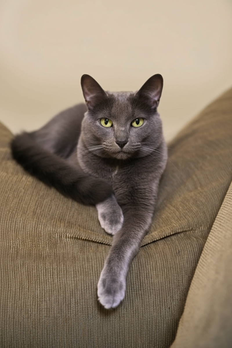 — Кораты имеют коренастое тело, голову в форме сердца и одинарную шерсть без подшерстка. Русские голубые обладают вытянутым телом, клиновидной головой и двойной плюшевой шерстью. Глаза коратов могут быть янтарно-зелеными или изумрудными, у русских голубых только ярко-зеленые.
