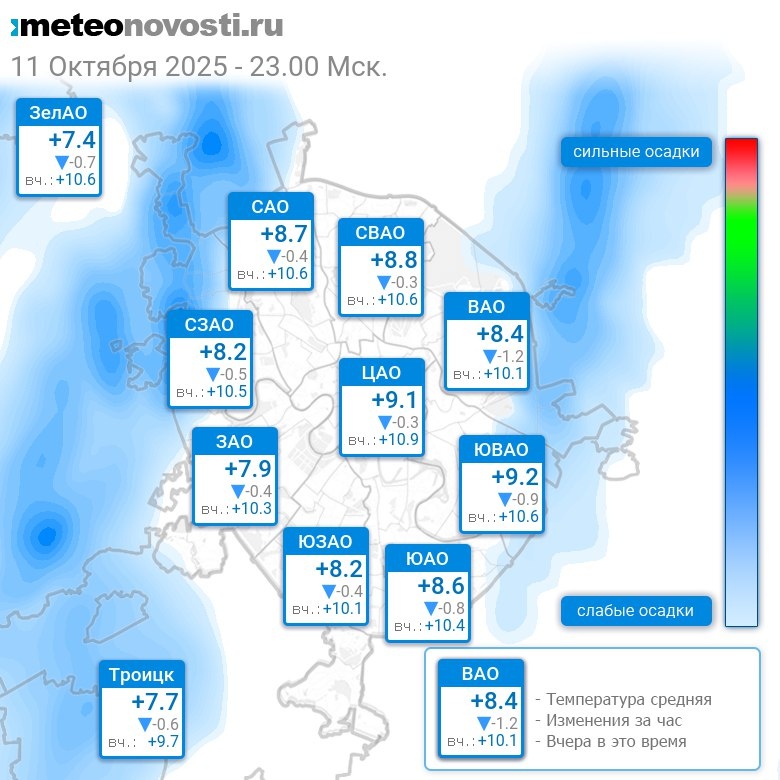 В 23:00 в Москве было от +7°C до +9.4°C, средняя температура +8.4°C #погода #Москва #осень #температура #11октября #суббота