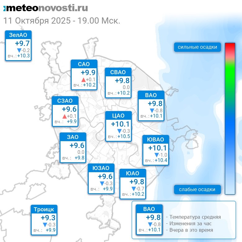 В 19:00 в Москве было от +8.8°C до +10.4°C, средняя температура +9.8°C #погода #Москва #осень #температура #11октября #суббота