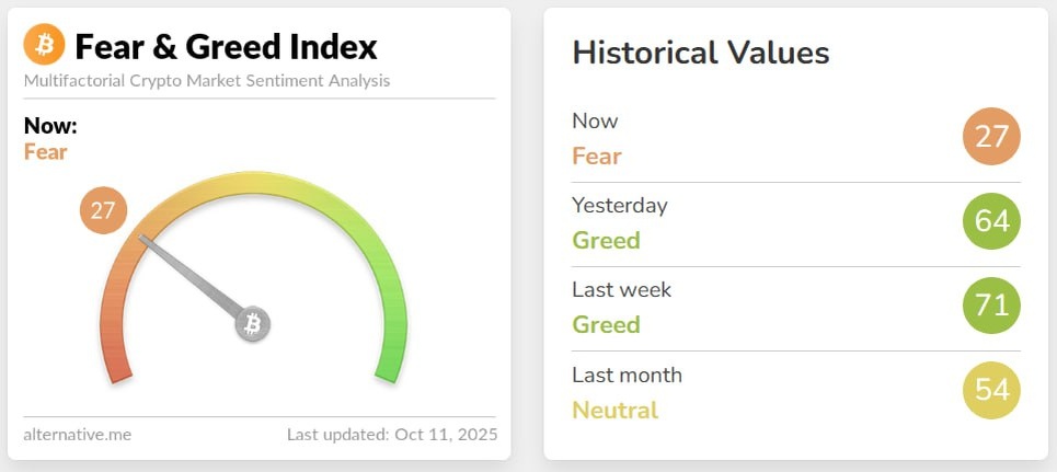 🔸Сегодня индекс страха и жадности опустился до минимального уровня с апреля — 27 пунктов (уровень страха).