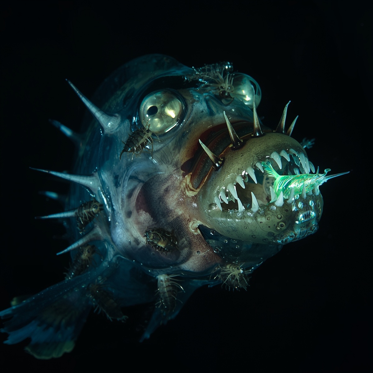 Марианская впадина. 8.124 метра под водой. Место где давление раздавит человека как консервную банку. И там... живёт ОНО. Июнь 2023. Тихий океан.Июнь 2023. Тихий океан. Японский рыбак Хироши Мацумото поднял сеть с глубины 8.000 метров. То что он увидел - заставило его закричать. В сети было существо. Прозрачное. Без костей. С зубами как иглы. И светилось в темноте. Fanfin Seadevil - Дьявол Глубин Учёные назвали его Fanfin Anglerfish (Морской Чёрт-Веер). Официальное имя: Caulophryne jordani Но рыбаки называют его "Глубинный Кошмар". Почему ОН так страшен: 🔹 Живёт на глубине 5.000-8.000 метров Там абсолютная темнота. Давление 800 атмосфер (как 800 машин на вас). Температура +2°C. Никакого света. Никогда. 🔹 Тело прозрачное Можно видеть внутренности. Желудок, сердце, кровь - всё видно. Эволюция сделала его невидимым. 🔹 На голове - фонарик Светящийся вырост (биолюминесценция). Привлекает добычу в темноте. Рыбка видит свет → плывёт → ЗУБЫ! 🔹 Зубы торчат наружу Рот не закрывается. Зубы