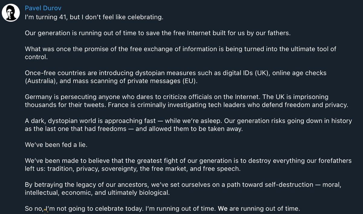 Павел Дуров, основатель Telegram, заявил, что страны, называющие себя защитниками демократии, превращают сеть в инструмент цифрового контроля, где под лозунгами "безопасности" и "ответственности" вводятся законы, ограничивающие приватность, свободу слова и право человека на независимое мнение. Великобритания внедряет цифровые удостоверения личности и сажает за посты, Австралия — проверку возраста при входе в интернет, Евросоюз готовит законы о сканировании личных сообщений. В Германии наказывают за критику чиновников, а во Франции возбуждают уголовные дела против тех, кто защищает приватность и свободу слова. Когда-то обещавший миру "открытые технологии" запад строит цифровую диктатуру. Британский Online Safety Act позволяет властям читать личные переписки под видом защиты детей. В ЕС действует Digital Services Act, вынуждающий платформы удалять неудобные мнения. В Германии за публикации, неугодные власти, вводят миллионные штрафы, а во Франции самого Дурова арестовывали за отказ чис