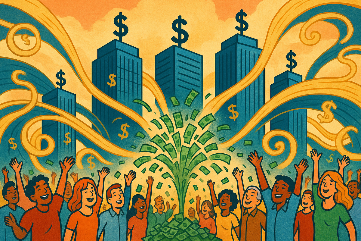 Эти потоки нужно распределять абсолютно равномерно, случайным образом между всеми людьми на планете. Не по заявкам, не по статусу, а как универсальный гравитационный шум — распределённый фонд энергии, который просто возвращает миру часть того, что он уже отдал. Тогда каждый человек становится косвенным акционером успеха всех. Чем богаче корпорации, тем богаче и все люди.