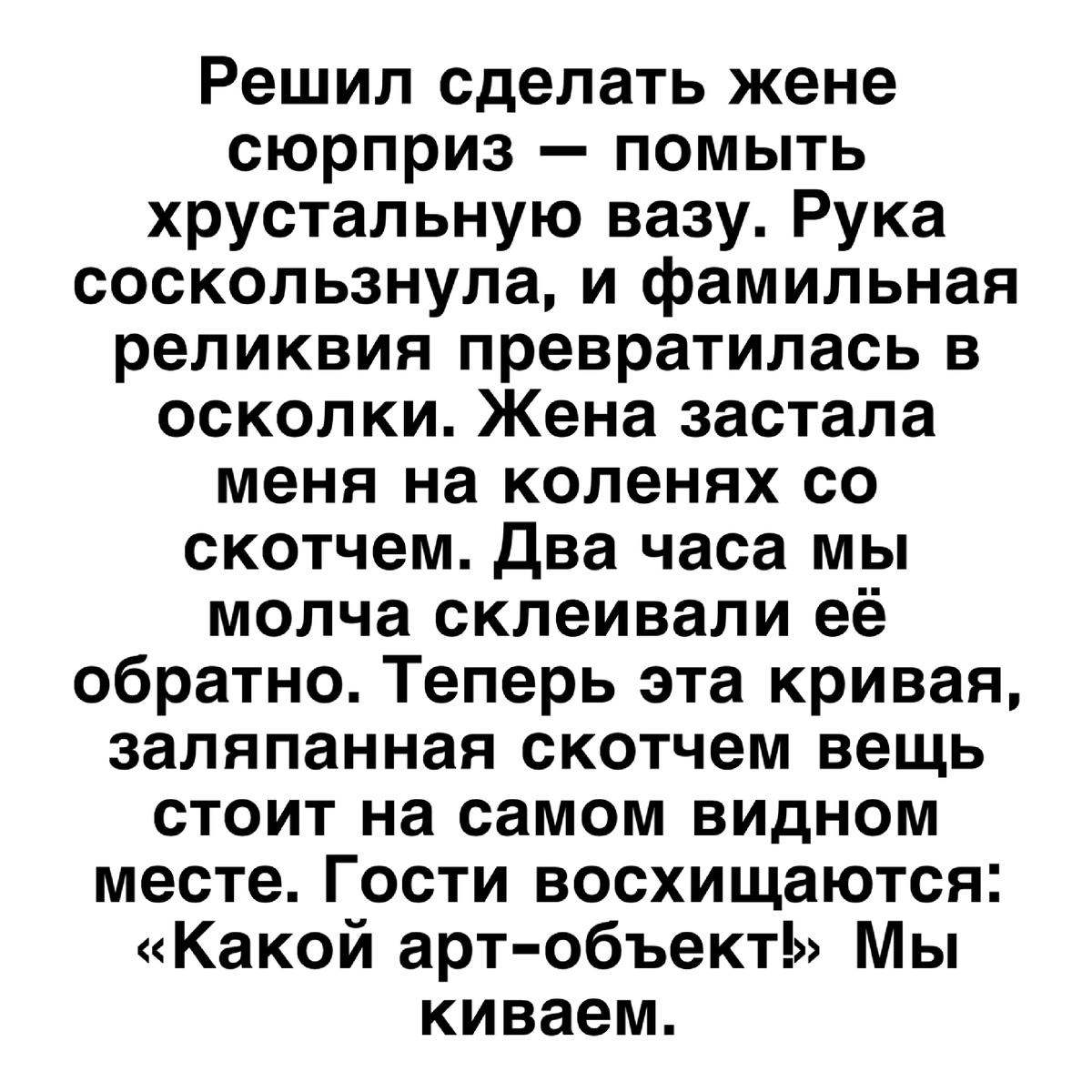 1. Ваза Решил сделать жене сюрприз — помыть хрустальную вазу. Рука соскользнула, и фамильная реликвия превратилась в осколки. Жена застала меня на коленях со скотчем. Два часа мы молча склеивали её обратно. Теперь эта кривая, заляпанная скотчем вещь стоит на самом видном месте. Гости восхищаются: «Какой арт-объект!» Мы киваем. 2. Оператор Позвонил в службу поддержки. Молодой человек с голосом, в котором читалась вся безысходность вселенной, попросил меня «подождать минутку». Я прождал сорок минут. Услышал его рыдания и как он бормочет: «Я не могу так больше». Потом он вернулся и бодро сказал: «Чем могу помочь?» Я положил трубку. 3. Кроссовки Пришёл на собеседование в крупную IT-компанию. Всё шло идеально, пока я не заметил, что на мне два разных кроссовка. Руководитель отдела смотрел на мои ноги с интересом антрополога, изучающего странный ритуал. Мне предложили зарплату выше ожидаемой. Видимо, решили, что это такая демонстрация креативности. 4. Лифт Застрял в лифте с незнакомцем