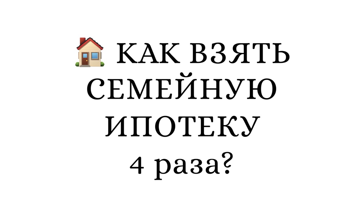 Никогда не берите льготную ипотеку с мужем. Сами посудите, вместе с мужем вы можете взять всего одну семейную ипотеку. А если брать по отдельности, то это уже две ипотеки. Никто об этом не говорит, но семейная ипотека это ипотека не на семью, это ипотека для каждого из супругов. Если при оформлении вы выведете супруга из сделки, то он сохранит свое право воспользоваться семейной ипотекой. И тогда, он тоже, сможет купить квартиру под льготную низкую ставку. Семейную ипотеку на семью можно взять 4 раза. ...и это не предельная цифра. А главное — все законно! Запомните, вот прям зазубрите: Семейная ипотека — это не на семью‼️ Это на каждого супруга: у вас обоих есть право на льготную ставку. И брать такую ипотеку вместе — самое глупое, что вы можете сделать. Просто профукаете свой шанс. - Если вывести супруга из сделки, то это уже не одна, а две Семейные ипотеки - Если после этого появляется новый ребенок и вы планируете покупку квартиры бОльшей площади, то каждый супруг может взять