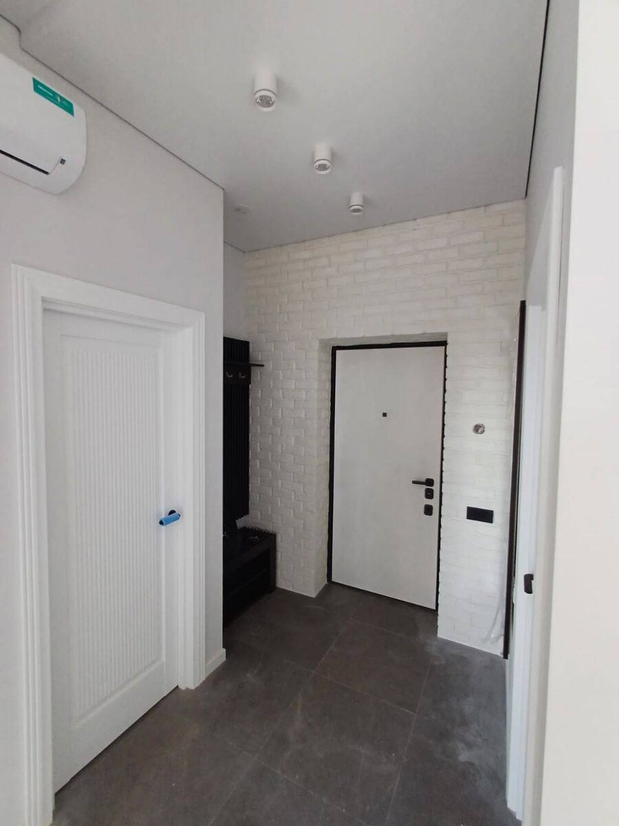 Не потому что «пафос», а потому что текстура — как у натурального сланца. И главное — вся квартира выдержана в одном цвете: от прихожей до душевой. Серый камень, белые стены, чёрные розетки —