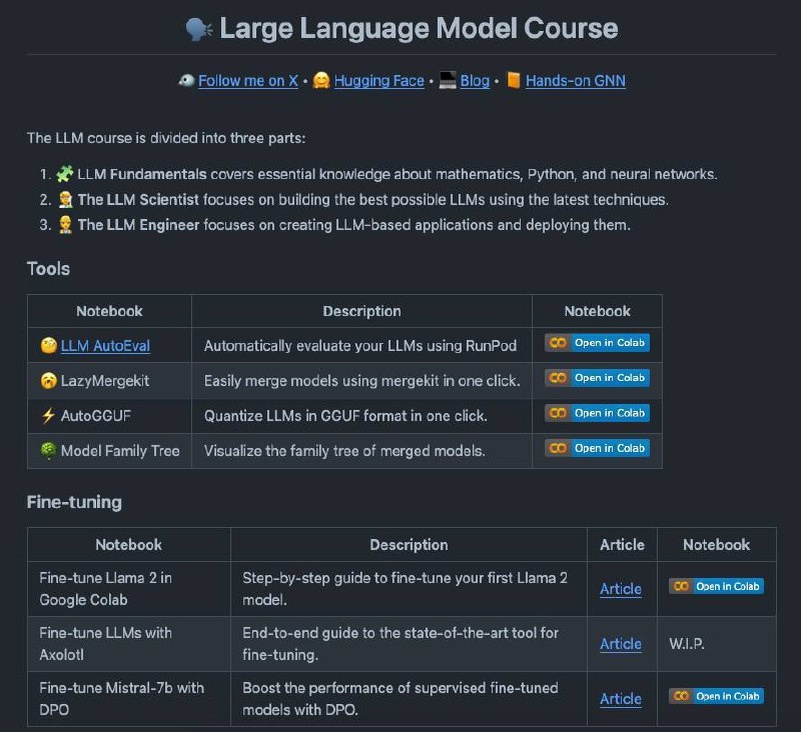 Large Language Model Course — это пошаговое обучение от Python-нуля до полноценной разработки ИИ-приложений. Внутри 3 части:
