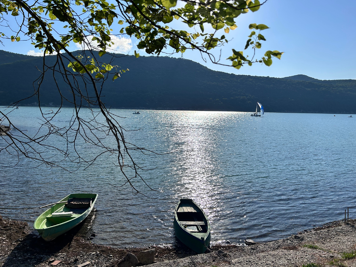 Кататься по изумрудной воде озера Абрау – приятно. Я сделала больше: когда мы остановились где-то в его середине, сиганула прямо с катамарана в прохладную воду! Не делайте так, если не уверены в собственных силах — здесь глубоко. Вообще, туристы в Абрау спокойно купаются, только, конечно, с берега — справа от набережной есть небольшой пляж, здесь даже имеются раздевалки. Но круче — нырнуть в чистейшую озёрную воду и поплавать рядом с катамараном, хотя не уверена, что вообще-то это не запрещено..)