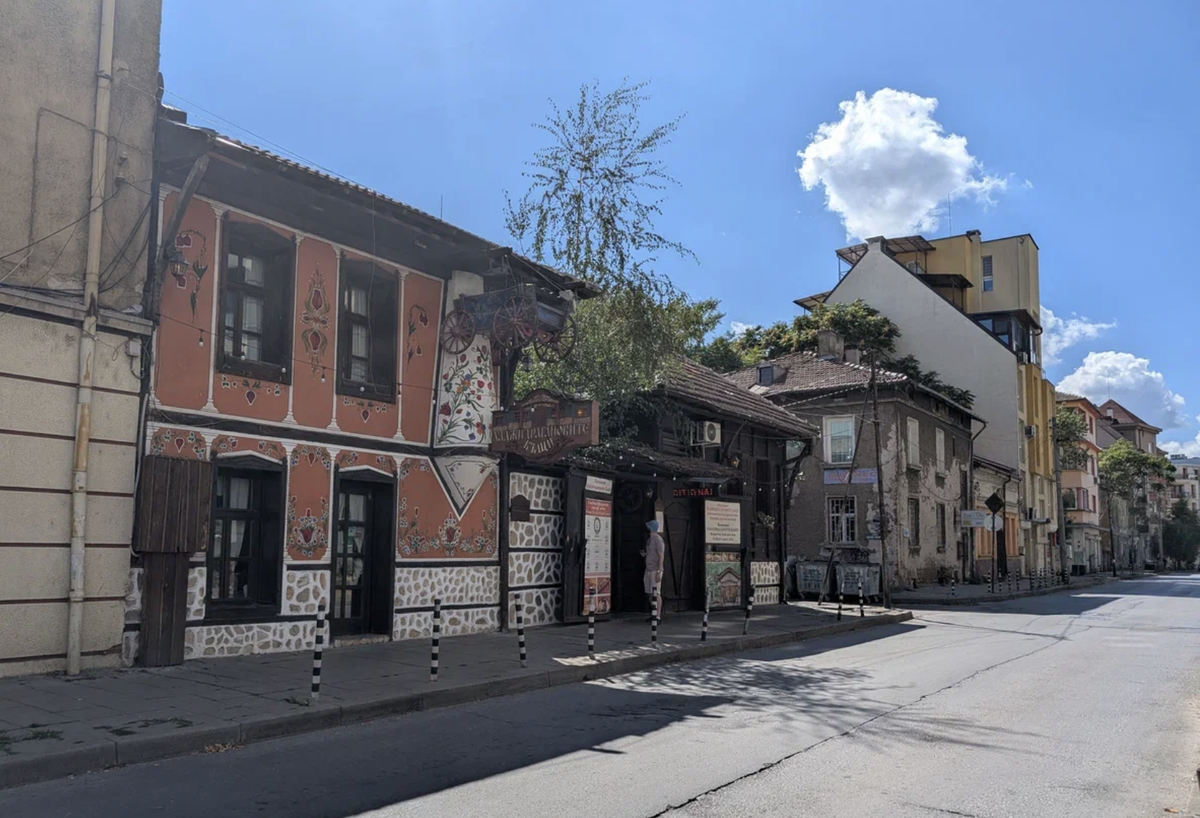 Я набрела на этот ресторан случайно, когда шла с автовокзала к Политехническом музею. Свернула на боковую улочку и увидела это: -Ух ты, какой интересный домик!- подумала я и бросилась его фотографировать. Оказалось, что домик состоит из двух частей - одна розовая, разрисованная традиционным узором, и другая, деревянная. Вот так смотрятся эти половинки вместе - не сочетаются никак! Разумеется, я поинтересовалась, что это за заведение: Оказалось, это Хаджидрагановите Кышти - многоговорящее название, ага. Но рядом стоял большой плакат с отзывами, и я поняла, что это- ресторан. Разумеется, я решила туда заглянуть, тем более, что вход смотрелся загадочно: Я чувствовала, что перемещаюсь в пространстве в другое время: Оказалось, что это не один домик, а два, поэтому такие разные! Просто рядом находятся! Зал оправдал мои ожидания - был таким же стильным - деревянные резные скамьи, мощные столы. Мне захотелось остановиться здесь, чтобы перекусить, потому что время близилось к обеду. Мне