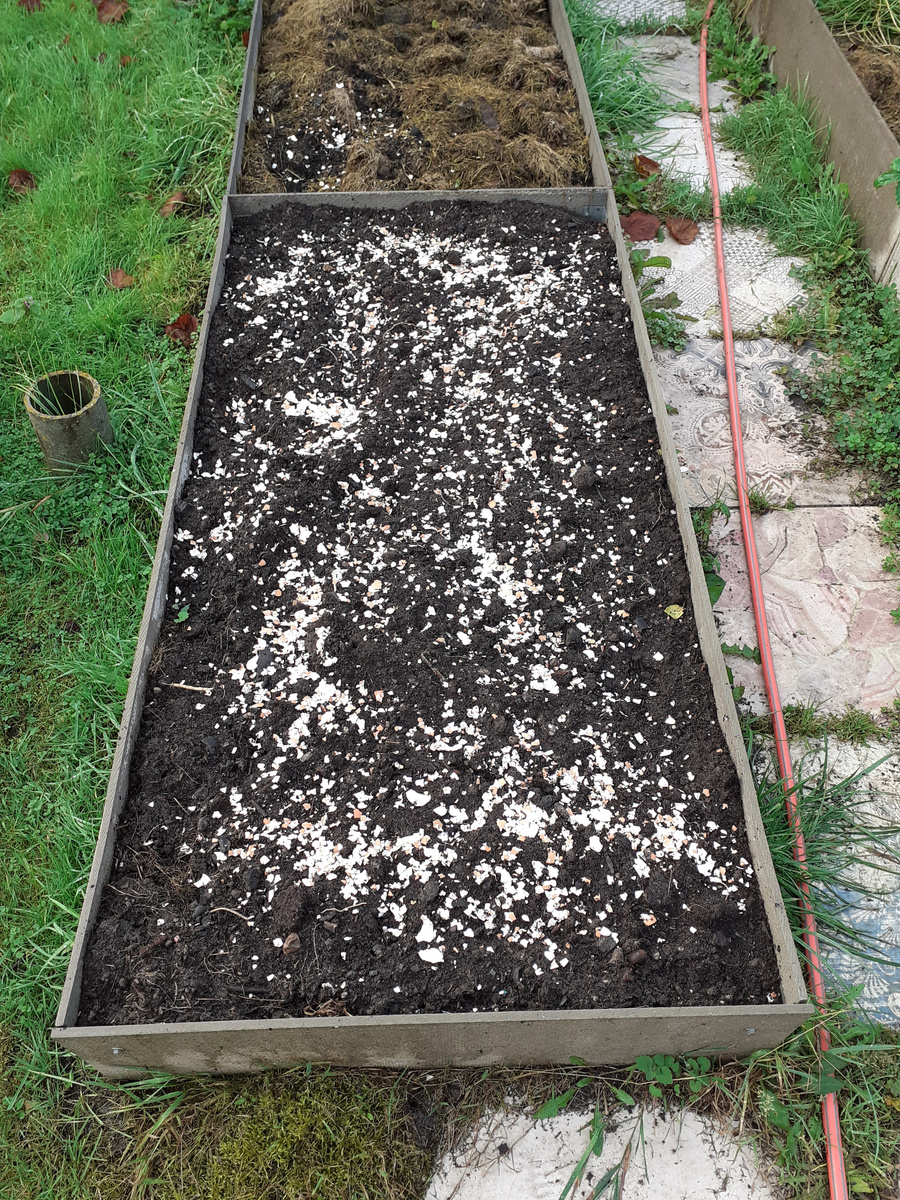 Одиннадцатого октября приехала я на дачку, сажать чеснок. Считается, что в Средней полосе его надо прятать в землю до 10 октября. Почти успела. Сажать буду в эту грядку. Я ее неделю назад засыпала землей из бочки от тыквы и посыпала скорлупой от яиц. Неплохая земля в бочке, но я решила перестраховаться и привезла еще покупной. Это же разговор не про чеснок, а про клубнику, которую я буду сажать следующим августом на эту грядку. Поэтому земельку надо хорошую с самого начала, чтобы чеснок, один из лучших компаньонов клубнички, не умер и чувствовал себя хорошо. Грунт куплен в, язык сломаешь, Лемана Про (умеют же наши люди давать зубодробительные названия сетевым магазинам). Засыпано золой и новым грунтом, обязательно протяпать плоскорезом Фокина. Готово к приему чесночинок. Вот такая раскладка. Тесновато, но у них же еды много, пусть сидят, работают. Чеснок в этом году крупный, ровный, молодец такой вырос. Не стыдно с соседями поделиться. Сажала на глубину ладони. Сверху землей засыпала и