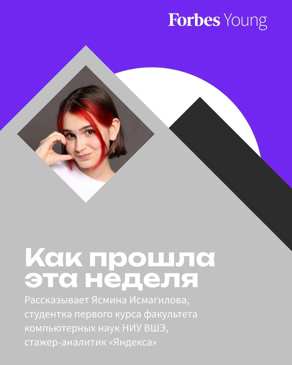 Сегодня в рубрике «Как прошла эта неделя» о своей жизни рассказывает 17-летняя студентка НИУ ВШЭ, стажер-аналитик «Яндекса» Ясмина Исмагилова. Как прошла твоя неделя? В свободные от учебы окна работала. На досуге гуляла с друзьями, играла в бильярд с коллегой и вырвалась на репетицию нашей с ребятами из МФТИ музыкальной группы. Ловила тот самый work-life blend, о котором все говорят. Чем занимаешься на работе? Я стажер в команде аналитики поисковых сценариев e-com «Яндекса». Если проще — мы помогаем вывести релевантные предложения, соответствующие вашему запросу «купить айфон Москва». Занимаюсь автоматизацией процессов обработки больших данных, ставлю эксперименты и визуализирую результаты. Что самое крутое и самое сложное в твоей работе? Самое классное — работать со множеством людей из смежных команд и каждый день узнавать что-то новое. Сложнее всего улучшать продукт, который развивается уже много лет. Постоянный квест по поиску фич. Сложно совмещать учебу со стажировкой?