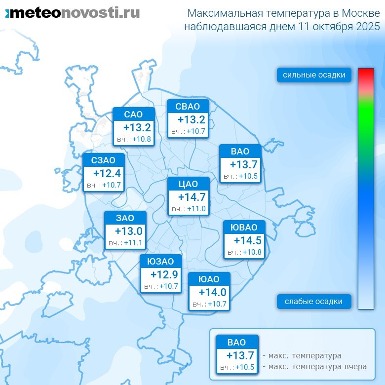 #за12часов #день Прошедший день 11 октября оказался на 3.2°C теплее вчерашнего. Максимальная температура днём в Москве оказалась на 2.1°C выше нормы, что в пределах обычных значений. Самая высокая температура +15.1°C была зафиксирована в 12 часов в центре города, а холоднее всего было на западе: +11.1°C. Разница по максимальной температуре в разных частях столицы составила за день 4°C. Максимальные порывы ветра днём достигали 4 м/с. Атмосферное давление за день понизилось с 743 до 742 мм.рт.ст. Было без существенных осадков Самый теплый день в Москве 11 октября был в 1935 году, когда максимальная температура составила +19.3°C, а холодный в 1936 году: +0.8°C. Перейти на сайт Прогноз погоды на 14 дней