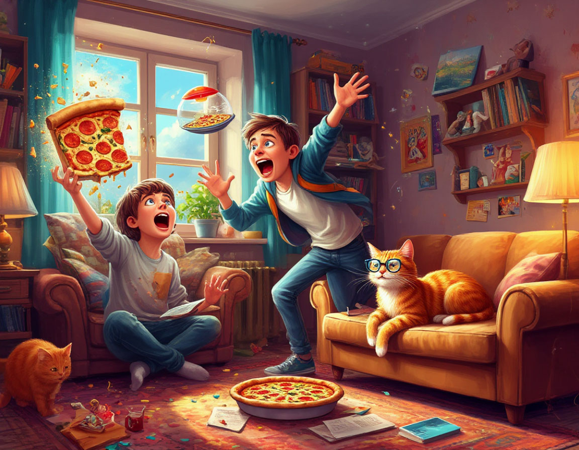В дверь позвонили. Пицца! Вася, как ошпаренный, бросился открывать. За дверью стоял курьер. В тот момент, когда Вася протянул ему деньги, коробка с пиццей вдруг зависла в воздухе, весело помахала крышкой и, как НЛО, плавно поплыла в сторону открытого окна.