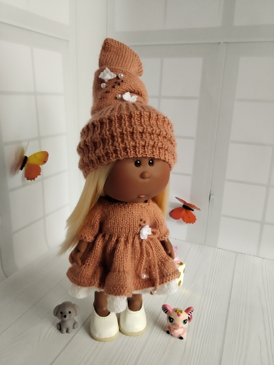 Пряжа - Alize Angora Gold (бежевая) Alize Lanagold 800 (белая) Спицы № 2. Платье. Набираем 42 петли. 1.Кром., планка (1 лиц., 1 изн.), 36 изн., планка (1 изн., 1 лиц.), кром. 2. Кром., планка(1 изн., 1 лиц.), 36 изн., планка(1 лиц., 1 изн.), кром. Если платье будет застегиваться на пуговичку, делаем дырочку в начале 3 ряда. 3. Кром., планка (1 лиц., 1 изн.), 5 лиц., 3️⃣ петли реглана - (приб., 1 лиц., приб.), 6 лиц., 3️⃣, 10 лиц., 3️⃣, 6 лиц., 3️⃣, 5 лиц., планка(1 изн., 1 лиц.), кром. 4 и все четные ряды вяжем по рисунку: изнаночные - изнаночными, лицевые - лицевыми. 5. Кром., планка (1 лиц., 1 изн.), 6 лиц., 3️⃣, 8 лиц., 3️⃣, 12 лиц., 3️⃣, 8 лиц., 3️⃣, 6 лиц., планка (1 изн., 1 лиц.), кром. Планку уже видно, продолжаем ее вязать, я дальше не буду указывать, и кромочные, чтобы не загромождать описание. 7. 7 лиц., 3️⃣, 10 лиц., 3️⃣, 14 лиц., 3️⃣, 10 лиц., 3️⃣, 7 лиц. 9. 8 лиц., 3️⃣, 12 лиц., 3️⃣, 16 лиц., 3️⃣, 12 лиц., 3️⃣, 8 лиц. 11. 9 лиц., 3️⃣, 14 лиц., 3️⃣, 18 лиц.