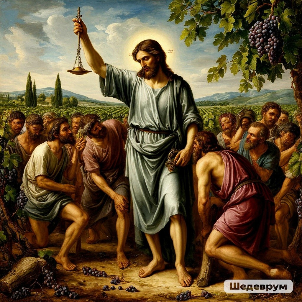 В теологии, да и не только, встречается множество трактовок данной притчи и во всех их сквозит явная или завуалированная апология ко псевдо нарушаемому в ней принципу справедливости. Например, одна из них, самая распространенная, утверждает, что Господь и есть мерило всего и вся, что он стоит над всем и справедливостью, в частности. В целом, с точки зрения теологии возможно это и так, но в нашем частном случае, данная притча полностью соответствует и ни в коем случае не нарушает фундаментальных принципов справедливости. Просто смотрят на нее почему-то все время с одного ракурса, сугубо узконаправлено -- абсолютно не объективно. Напомним данную притчу: