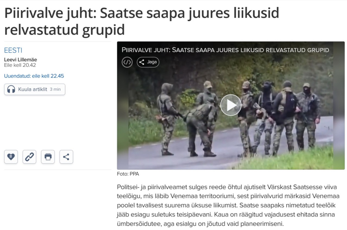 Эстонские СМИ: Департамент полиции и погранохраны временно перекрыл участок дороги от Вярски до Саатсе, проходящий по территории России, в пятницу вечером в связи с тем, что пограничники заметили на российской стороне передвижение более крупного, чем обычно, подразделения. Участок дороги, известный как «саатсеский сапог», останется закрытым до вторника. О необходимости строительства объездной дороги там говорят давно, но пока дело дошло только до стадии планирования. В течение всего дня в пятницу пограничники зафиксировали активизацию деятельности и передвижения вооруженных формирований с российской стороны в районе Саатсе-Саапа. «Мы видели, как на границе и в непосредственной близости от неё двигались различные вооружённые группы. Судя по форме, это были определённо не пограничники. Начиная с 3 часов утра наши патрули зафиксировали, что группы выдвигаются на дорогу, проходящую через Саатсе-Саап, и, хотя сначала они двигались вдоль дороги, в какой-то момент выстроились перпендикулярн