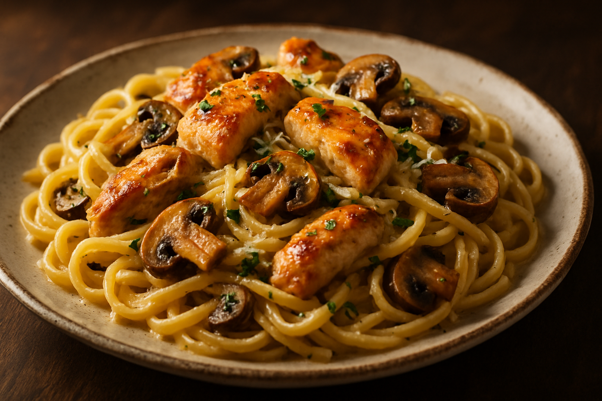Устали после работы, а семья уже ждет ужин? Приготовьте пасту с курицей и грибами в сливочном соусе всего за 15 минут! Этот рецепт сочетает простоту, сытность и изюминку фьюжн-кухни. Подходит всем — от малышей до взрослых гурманов. Паста выручает, когда времени в обрез. Варится сама, пока вы занимаетесь соусом. Курица дает белок, грибы добавляют аромат, сливки делают блюдо нежным. А главное — готовится быстрее, чем доставка пиццы! Фишка рецепта — соевый соус. Он придает глубину вкуса и работает как природный усилитель. Плюс можно использовать местные грибы: лисички из сибирского леса, белые с Урала или обычные шампиньоны из магазина. Время: 5 минут подготовка + 10 минут готовка = 15 минут