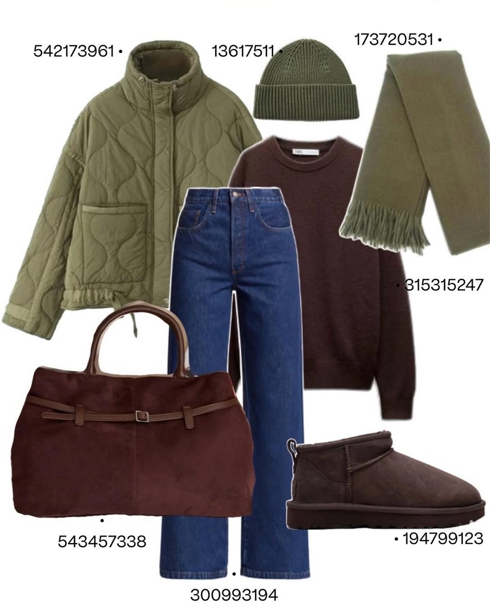- Верх из первого комплекта (оливковая куртка 542173961) отлично дружит с трикотажными брюками 415334713 и ботинками 498822159 — выходит тёплая прогулочная вариация.
