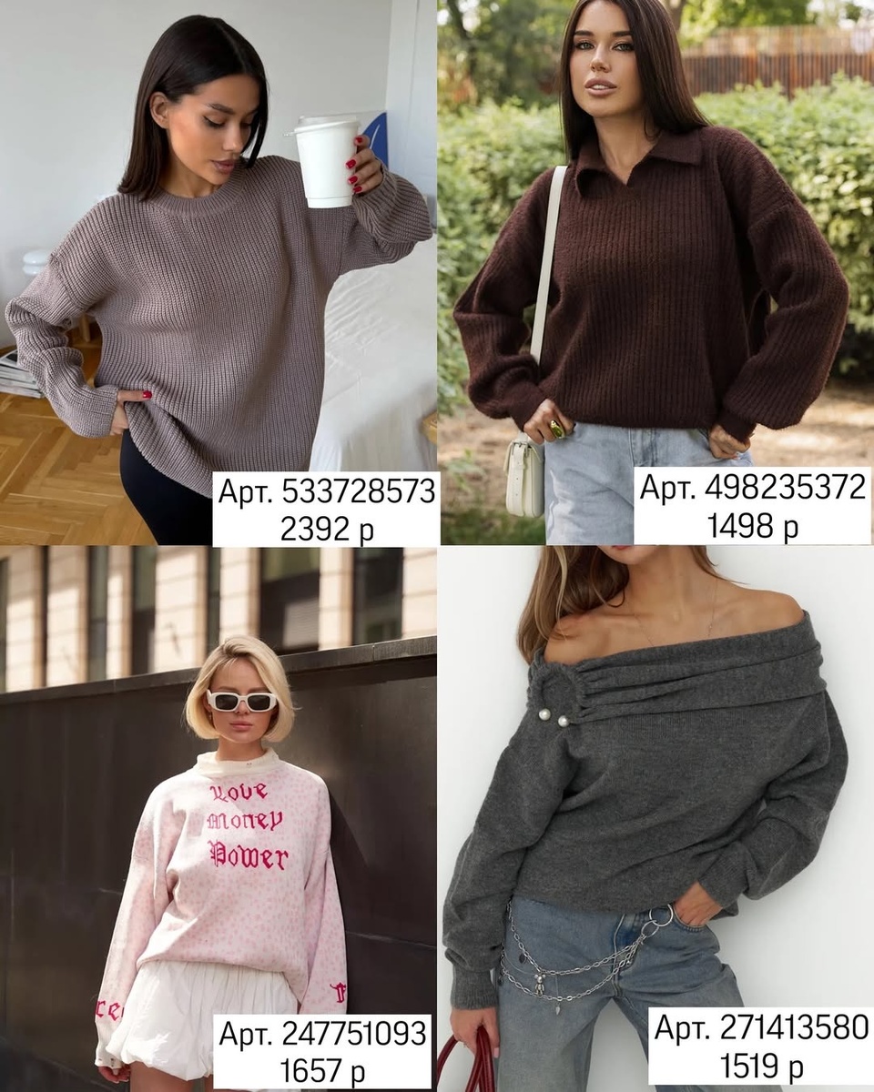Тёплый джемпер — это не просто вещь на холодный день. Это основа зимней капсулы, способ быстро собрать гармоничный образ и подчеркнуть характер. Я собрала для вас подборку трикотажа с WB: мягкие базовые модели, акцентные фактуры, романтичные детали и дерзкие принты. Ниже — подробный разбор строго по артикулам, как сидит каждая вещь, с чем носить и как сделать комплект дороже на вид. Базовый джемпер цвета какао. Плотная резинка, мягкое спущенное плечо, длина закрывает верх бёдер. Вязка не добавляет объёма, красиво держит форму по низу и манжетам. Совет стилиста: сочетайте с молочными широкими брюками и сапогами-трубами. Чтобы вытянуть силуэт, заправьте край спереди в пояс и добавьте узкий ремень. Шоколадный пуловер с воротником-поло. Трикотаж средней плотности, рукав чуть объёмный, посадка полусвободная. Воротник «рисует» линию шеи и добавляет структуру. Совет стилиста: идеально к голубым прямым джинсам и кожаной сумке-седлу. Поверх — тренч или стёганая куртка. Пудровый свитшот с надпи