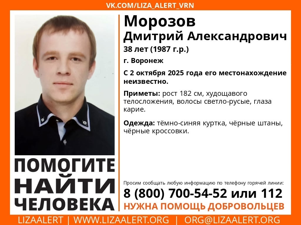 Волонтеры поискового отряда «Лиза Алерт» объявили поиски 38-летнего воронежца Дмитрия Морозова. Парень бесследно пропал 2 октября, о его местонахождении ничего неизвестно.