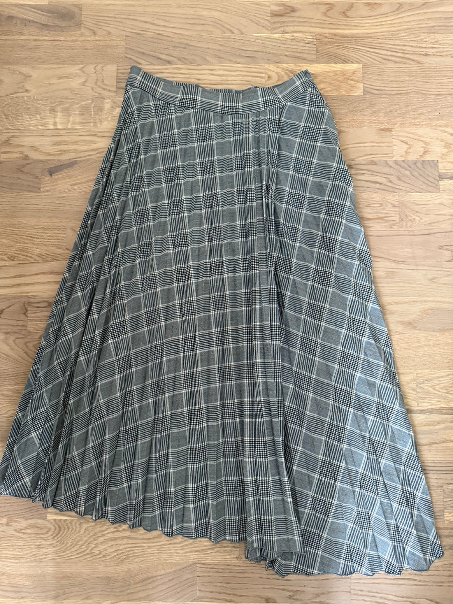 Сегодня утром я опубликовала обзор сэконд хенда со стоком из Англии: H&M Zara Mark&Spencer и другие бренды в этом магазине были представлены вплоть до размерных рядов [url=https://dzen.ru/a/aODCWmu5nA1z548v]Обзор[/url] Вещи были новыми и из актуальных коллекций! Поэтому уйти без покупок я не могла. Но постаралась выбрать наиболее актуальные вещи. И такой вещью стала плиссированная юбка в клетку гленчик с имитацией запаха и асимметрией. Вот она: У нее прекрасная длина - на ладонь выше щиколоток, и универсальная расцветка: белый, черный, серый и рыже-коричневый, он же кэмел. И прекрасный состав: 33 % вискозы и значит, что тело будет дышать. Чуть ниже я покажу то минимальное количество комбинаций с ней, которые составила из того, что подвернулось под руку. Вторая вещь - джемпер карамельного цвета. Я примеряла два: молочный и этот и решила забрать более темный вариант. В нем 17 % шерсти, нейлон, полиамидид вездесущий акрил. Но считаю, что на пару сезонов его хватит, пока такая модель не