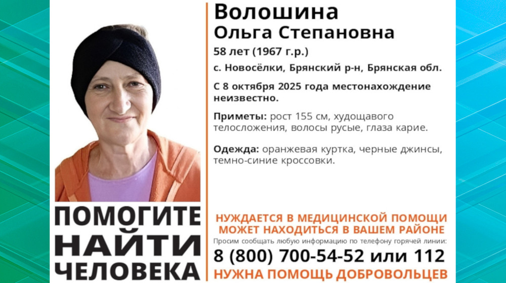 Еще утром в субботу, 11 октября, «Брянская Губерния» сообщала, что волонтеры отряда «Лиза Алерт» Брянской области начали поиски женщины в оранжевой куртке – 58-летней Ольги Волошиной, которая нуждается в медицинской помощи. Поисковики обращались ко всем, кто мог ее встретить, откликнуться и сообщить, где и при каких обстоятельствах они ее видели. Были распространены и приметы женщины, невысокого роста, худощавого телосложения. Сообщалось, что она ушла из дома еще 8 октября, и с тех пор о ней ничего не было известно. Очевидно, розыскное объявление, которое распространили СМИ, быстро разлетелось и в соцсетях. Уже к вечеру субботы, около 18 часов, в официальной группе поискового отряда появилось короткое в таких случаях сообщение в комментариях, что женщина найдена погибшей. Обстоятельства гибели не уточняются, подробности обнаружения не разглашаются. Поисковики принесли искренние соболезнования родным и близким погибшей. Поиски пропавшей под Брянском Ольги Волошиной свернули: женщина пог