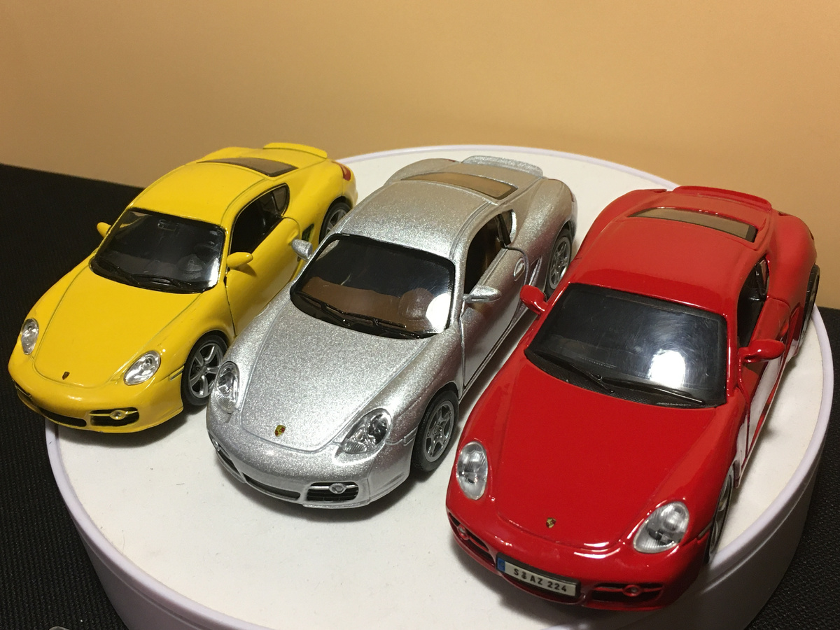 Здравствуйте, Друзья! Подхожу я на днях к полкам Bburago, и мой взор попадает на Porsche Cayman S красного цвета в 32 масштабе. Покупал я его с рук в начале 2025 года, состояние идеальное, но без коробки, тогда меня очень подкупила цена. Модель симпатичная, классический современный Bburago. Напомню, к Порш я неравнодушен, поэтому всегда мониторю предложения по данной марке. Возникла мысль, сделать сравнительную статью. Вспомнил, что точно есть такая же Велли и, вроде, Маисто. Хотелось сравнить и выбрать лучшую модель. Касалось бы, тут все понятно, где Ббураго, а где Маисто с Велли. Игра в одни ворота...Подхожу к полкам с Маисто и понимаю, что именно такой модели я тут не найду. Далее, иду к Велли, нахожу, даже две (красную и желтую), беру в руки, рассматриваю...Хм... А не так все плохо, модель от популярного китайского бренда выглядит вполне достойно. Поршей у меня разных много. Хочу найти все-таки третью модель для сравнительной статьи. И нахожу. Kinsmart, серебристого цвета. И дерби становится интересным. Так пусть, победит сильнейший...