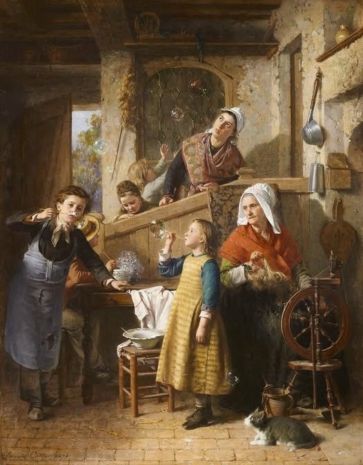 Интерьер коттеджа с детьми, пускающими мыльные пузыри, 1878