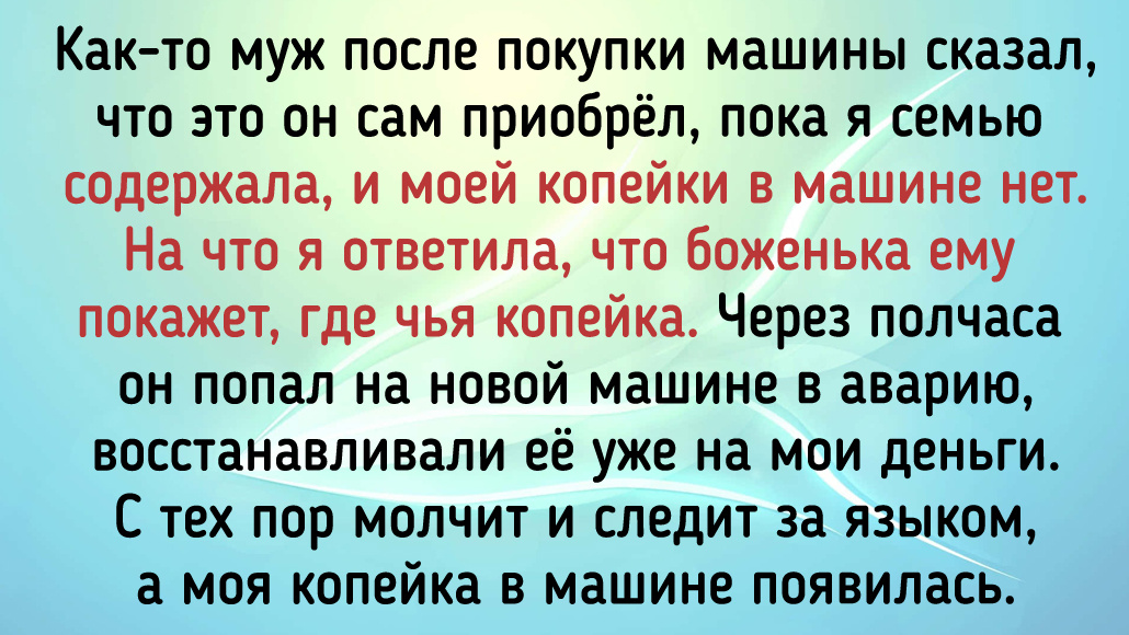 Как-то муж после покупки машины сказал, что это он сам приобрёл, пока я семью содержала, и моей копейки в машине нет. На что я ответила, что боженька ему покажет, где чья копейка. Через полчаса он попал на новой машине в аварию, восстанавливали её уже на мои деньги. С тех пор молчит и следит за языком, а моя копейка в машине появилась. © Ирина Скрипник / ADME