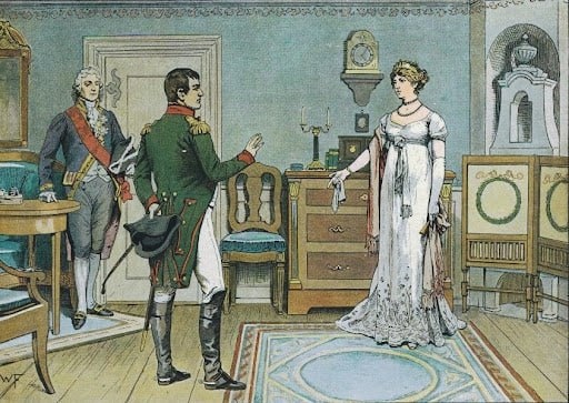 Летом 1807 года на плоту посредине реки Неман императоры Наполеон и Александр I обсуждают раздел Пруссии