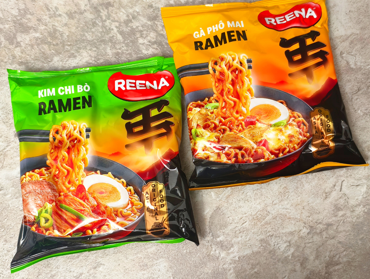 Всем привет! Сегодня буду пробовать вьетнамские недорогие рамены от бренда Reena. Покупал в Дикси по акции - 89,9 р. Начну с рамена с кимчи. Масса 115 граммов. Порция чуть побольше, чем стандартный Доширак. Состав стандартный, длинный. Лапша пшеничная. Есть сушёная кимчи, растительные сливки. Из пряностей есть перец чили, имбирь, перец красный. Импортер: ООО "Сэлтикс Сиберия", г. Новосибирск. Лапшу нужно варить с суповой основой и овощами. Буду готовить по рецепту. В комплекте брикет среднетолстой лапши. Овощная добавка с соевым мясом и специи. Варю пять минут, помешивая. Получается такой суп. Аромат приятный. Цвет бульона не термоядерный, оранжевый. Бульон по вкусу приятный. Сладковатый. Кимчи рамены обычно термоядерные, а этот с легчайшей остринкой. Вкуса кимчи как такового нету. В целом нормальный бульон, но ничего необычного. Что-то типа Доширака с кимчи, но тот вариант будет поприятнее. Кто хочет попробовать, как по мне, нормальный кимчи рамен, советую такой вариан