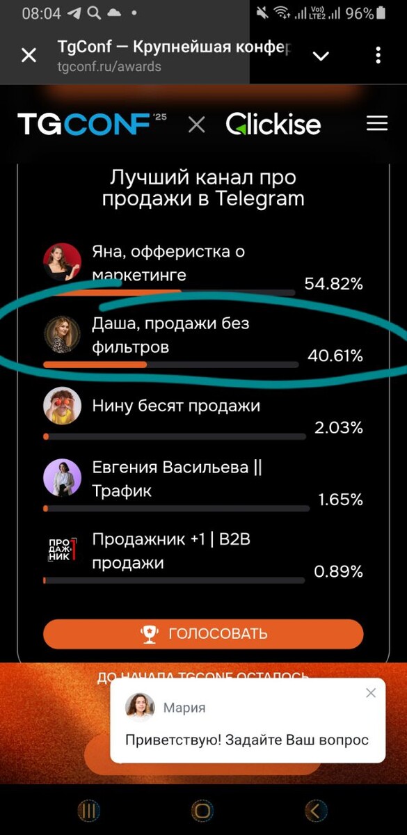 Дорогие мои, всем привееееет ❤️❤️❤️ Кому не сложно, проголосуйте, пожалуйста, за моего любимого маркетолога Дашу в голосовании за самый лучший канал по продажам. Там очень просто (без регистрации)🙏 https://tgconf.ru/awards/ Багодаря Даше я выстроила свой канал и пишу посты, так, чтобы было интересно, понятно, а главное честно и от души. И очень хочу, чтобы Даша победила, т.к. она очень крутой специалист и в сфере продаж и маркетинга, и вообще очень тёплый и классный человек! Буду рада вашей поддержке 🤗 Пост об этой номинации в канале Даши здесь! 🫶🫶🫶🫶🫶🫶🫶🫶🫶🫶🫶