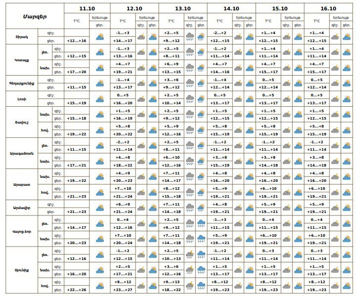 Днём 11 октября, в ночь на 12 октября и с 14 по 16 октября на территории республики ожидается погода без осадков. Вечером 12 октября в отдельных районах, а 13-го — в большинстве регионов ожидаются дожди. Об этом Арменпресс сообщили в Центре гидрометеорологии и мониторинга Министерства окружающей среды Республики Армения. Ветер северо-западный, скорость – 2-5 м/с, 13 октября в отдельных районах ожидается усиление ветра до 15-18 м/с. Температура воздуха во второй половине дня 13 октября понизится на 5-7 градусов. В Ереване днем 11 октября и 14–16 октября ожидается погода без осадков. Вечером 12 и 13 октября ожидаются дожди.