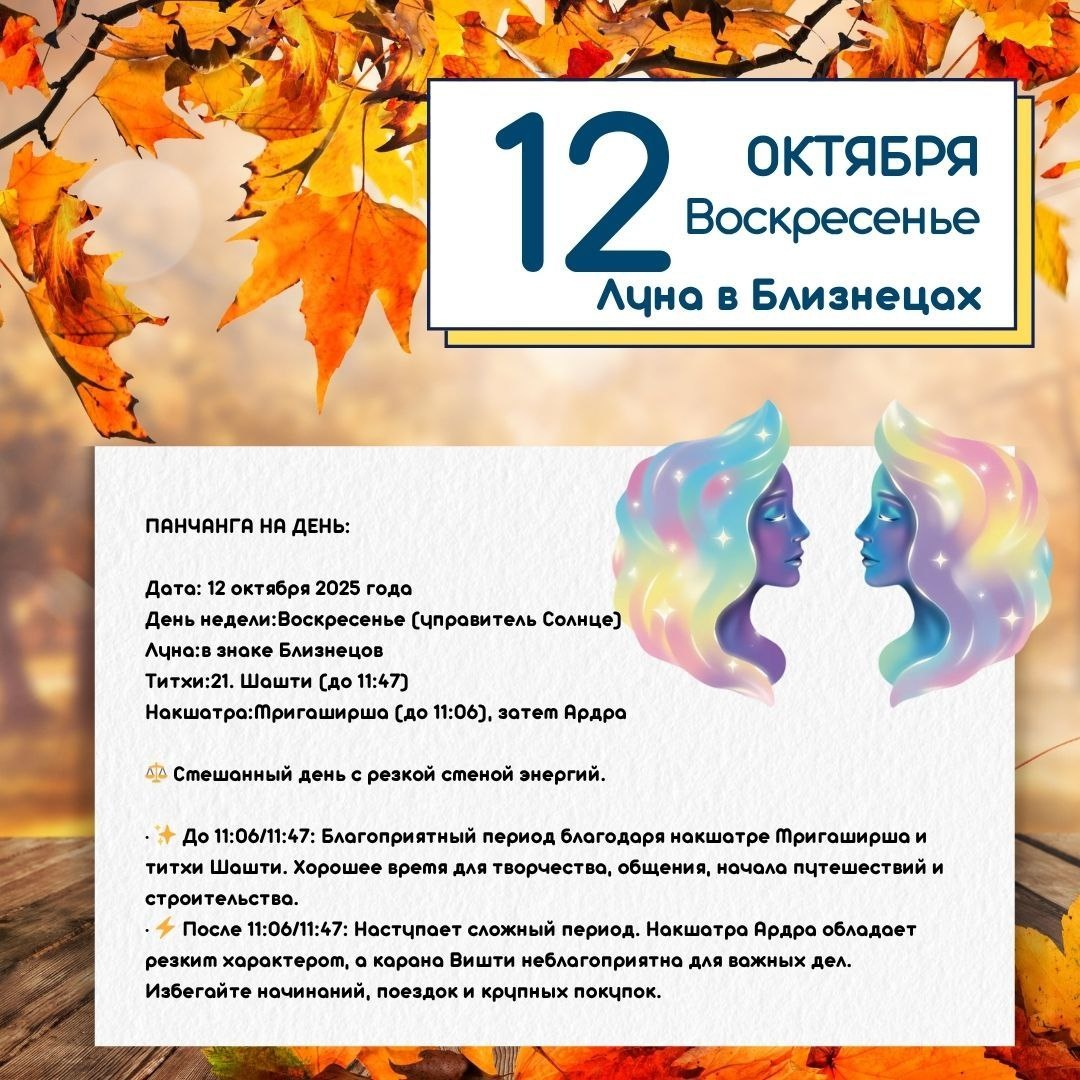 🌌 АСТРОДАЙДЖЕСТ на 12 октября 2025 Сегодня воскресенье — день Солнца, нашей жизненной силы и по ведической астрологии начало недели. А, как известно, как начнём что-то, так и сложится. Поэтому сегодня смотрим на показатели дня. Сегодняшний день — как качели: взлёты и падения. Главный совет: сделайте всё важное ДО полудня! А почему — читайте ниже.👇 🌞 ОБЩАЯ КАРТИНА ДНЯ День Солнца в аналитичной Деве зовет нас к порядку и совершенству.Идеально для планирования, работы с деталями и творчества. Луна тоже в знаке Меркурия, Близнецах, но днём переходит в накшатру Ардру, и после 11:46 включаются энергии препятствий. Не форсируем события — практикуем терпение. 🗓️ РАСПИСАНИЕ ДНЯ: ЛОВИМ ВОЛНУ · ☀️ УТРО (до 11:06): Золотое время! Луна в любознательной Мригашире — отлично для старта дел, общения, лёгкого творчества и домашних хлопот. Энергия 21 лунных суток добавляет удачи в творчестве и ремонте. · ⚡️ ДЕНЬ (с 11:46): Включаем режим "осторожно!". Включается Вишти-карана (препятствия) и Пари