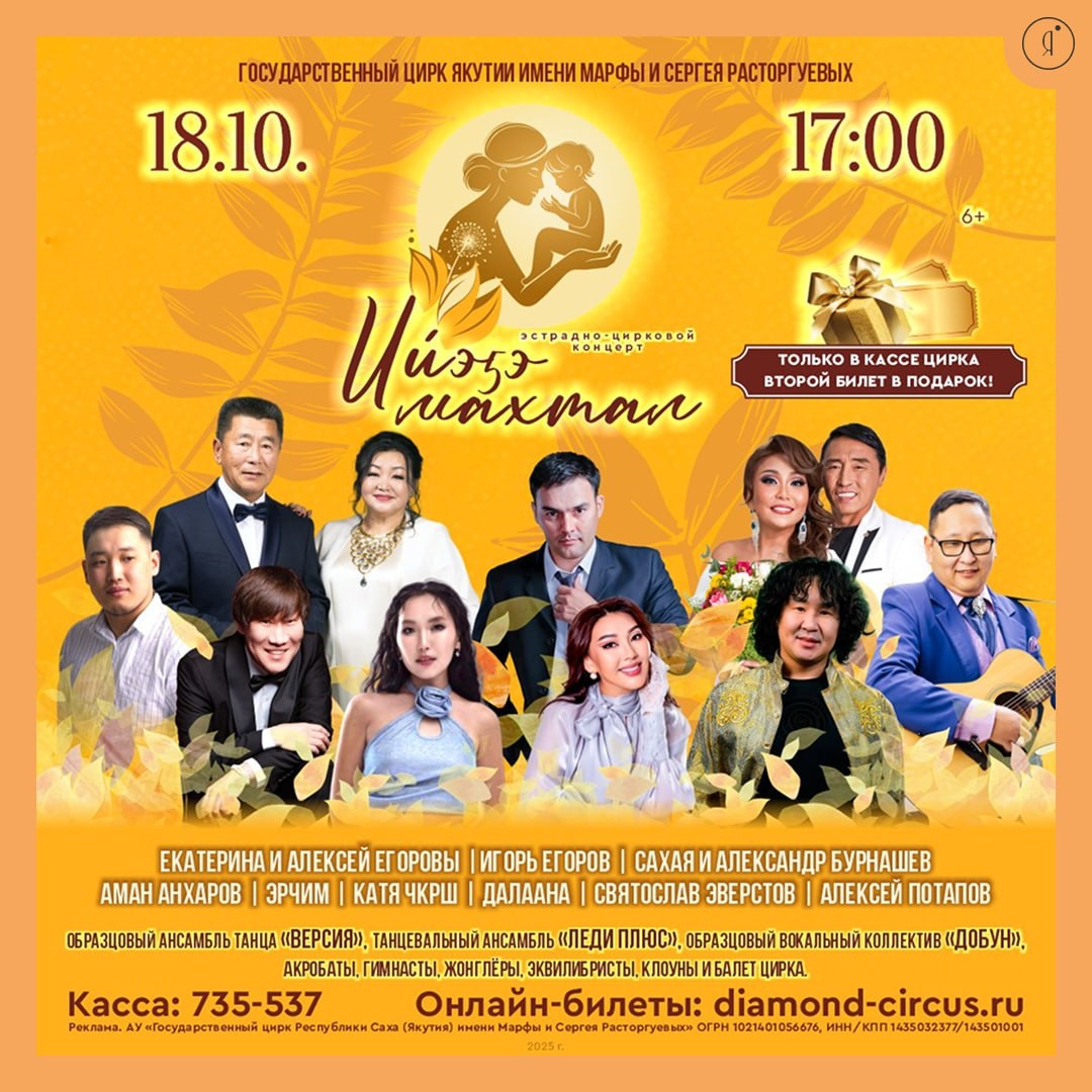 Праздничный концерт ко Дню Матери #Концерты 18 октября в 17:00 состоится эстрадно-цирковой концерт «ИЙЭҔЭ МАХТАЛ» с участием лучших артистов республики! 🤩В программе: Воздушная гимнастика и акробатика Выступления звезд якутской эстрады Яркие номера от танцевальных коллективов Веселые клоуны и цирковой балет В честь праздника только в кассе цирка при покупке одного билета - второй получаете в подарок! Участники: Екатерина и Алексей Егоровы, Игорь Егоров, Сахая и Александр Бурнашевы, Аман Анхаров, Далаана, Эрчим, Катя ЧКРШ, Святослав Эверстов, Алексей Потапов и другие. 🤩18 октября |17:00 Цирк им. Марфы и Сергея Расторгуевых Билеты Справки: 735-537, 42-95-68 Возрастное ограничение: 6+ Online Якутия | Ждем вас в МАХ