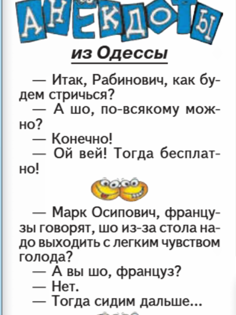 Да! Да! Да! Представьте себе: есть такой 82-летний дедушка, рыбак сочинитель и собиратель анекдотов, который знает все секреты вод Чёрного моря, и может вам (нам, мне) рассказать множество забавных историй. Его анекдоты, полны местного колорита и мудрости, накопленной за долгие годы.