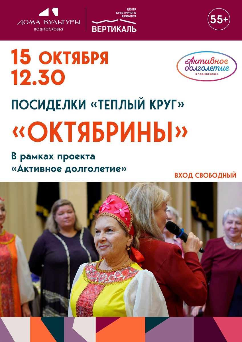✨ Приглашаем пущинцев старшего поколения на посиделки «Теплый круг» 🍁«Октябрины» — это не обычай, это праздники Октября! 💬На наших посиделках мы поговорим об интересных праздниках этого месяца, традициях и приметах. ☕Вас ждут интересные викторины, выступления творческих коллективов и, конечно же, ароматный чай. 🚫 Возраст: 55+ 📆 15.10.2025 🕒 12:30 🏢 ЦРК "Вертикаль" г. Пущино 📍 г.о. Серпухов, г. Пущино, проспект Науки, 7 💰 Вход свободный❗️ ⭐Поддержать канал голосом 💰 Вакансия - курьер в Серпухове ✅ Мероприятия Серпухов https://dzen.ru/id/66f01c6eb4c6fe60c9ca1608 http://vk.com/serpukhov_events http://dzen.ru/serpukhov_events