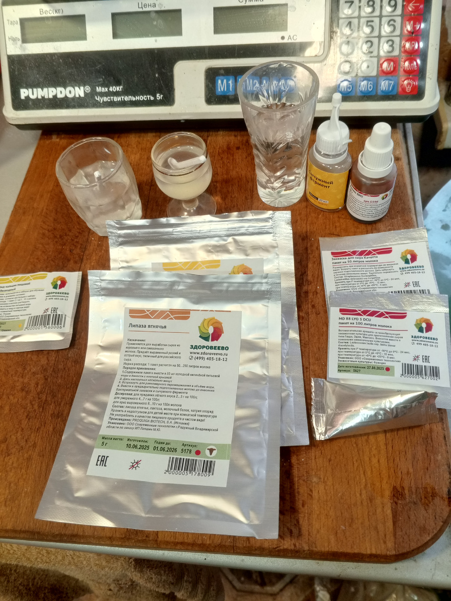 Для варки сыра: фермерское молоко, хлористый кальций, сычужный фермент, закваски: термофильная (состав: lactococcus lactis subsp. diacetilactis, Lactococcus Lactis subsp.cremoris, Lactococcus Lactis subsp. Lactis), липаза ягнячья, анато.