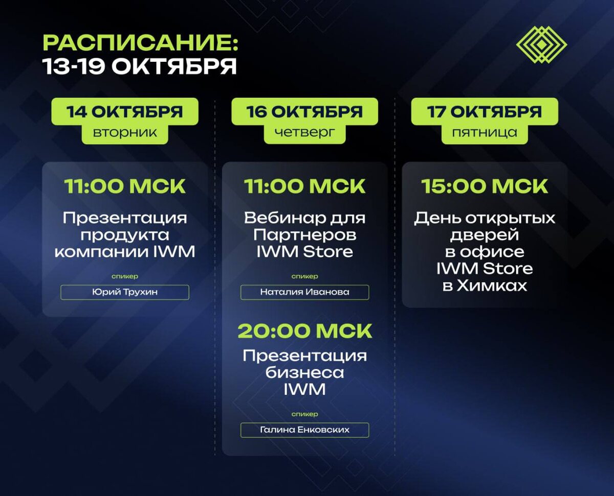 📱Расписание на неделю! Возможности не приходят сами — вы создаете их. — Крис Гроссер. Завтра начинается новая неделя, и мы готовы наполнить ее событиями, которые вы не захотите пропустить. Сохраняйте себе расписание. Инвестируйте в ваше будущее, в ваш рост, в вашу экспертизу. Мы хотим, чтобы вы чувствовали себя частью сообщества, которое движется вперед, которое не боится перемен и которое умеет находить решения даже в самых сложных задачах. Наша цель – дать вам инструменты, идеи и, главное, энергию для новых свершений. Приходите. Слушайте. Участвуйте. Ваши вопросы – это наш драйвер. Ваши успехи – это наша главная награда. Мы создаем пространство, где можно не просто получить информацию, но и найти единомышленников, обрести новые связи и, возможно, открыть для себя то, что изменит ваш взгляд на привычные вещи. Ждем вас на наших мероприятиях IWM!